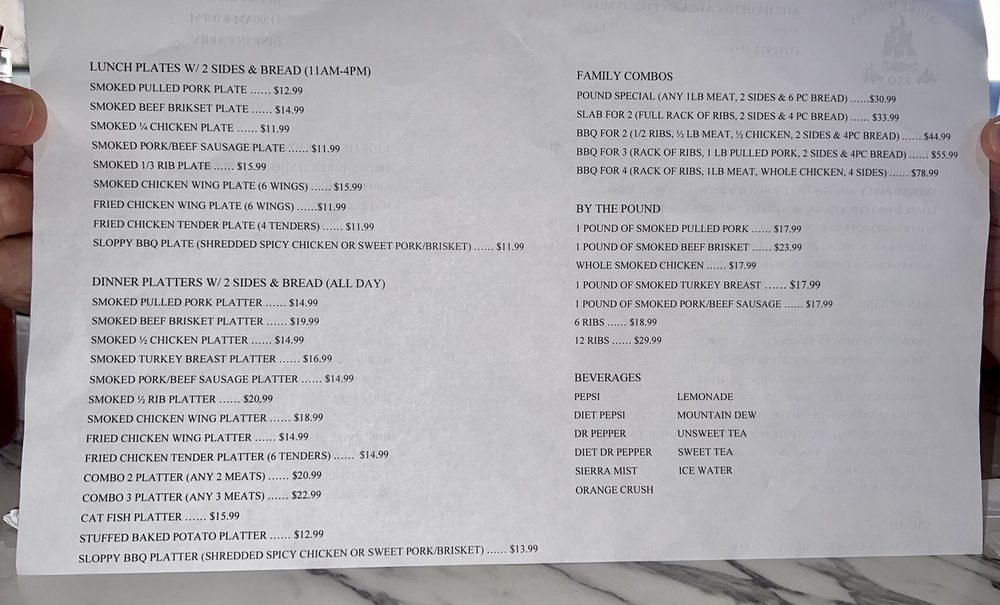 Rack ribs, 1 lb. pulled pork, 2 sides.